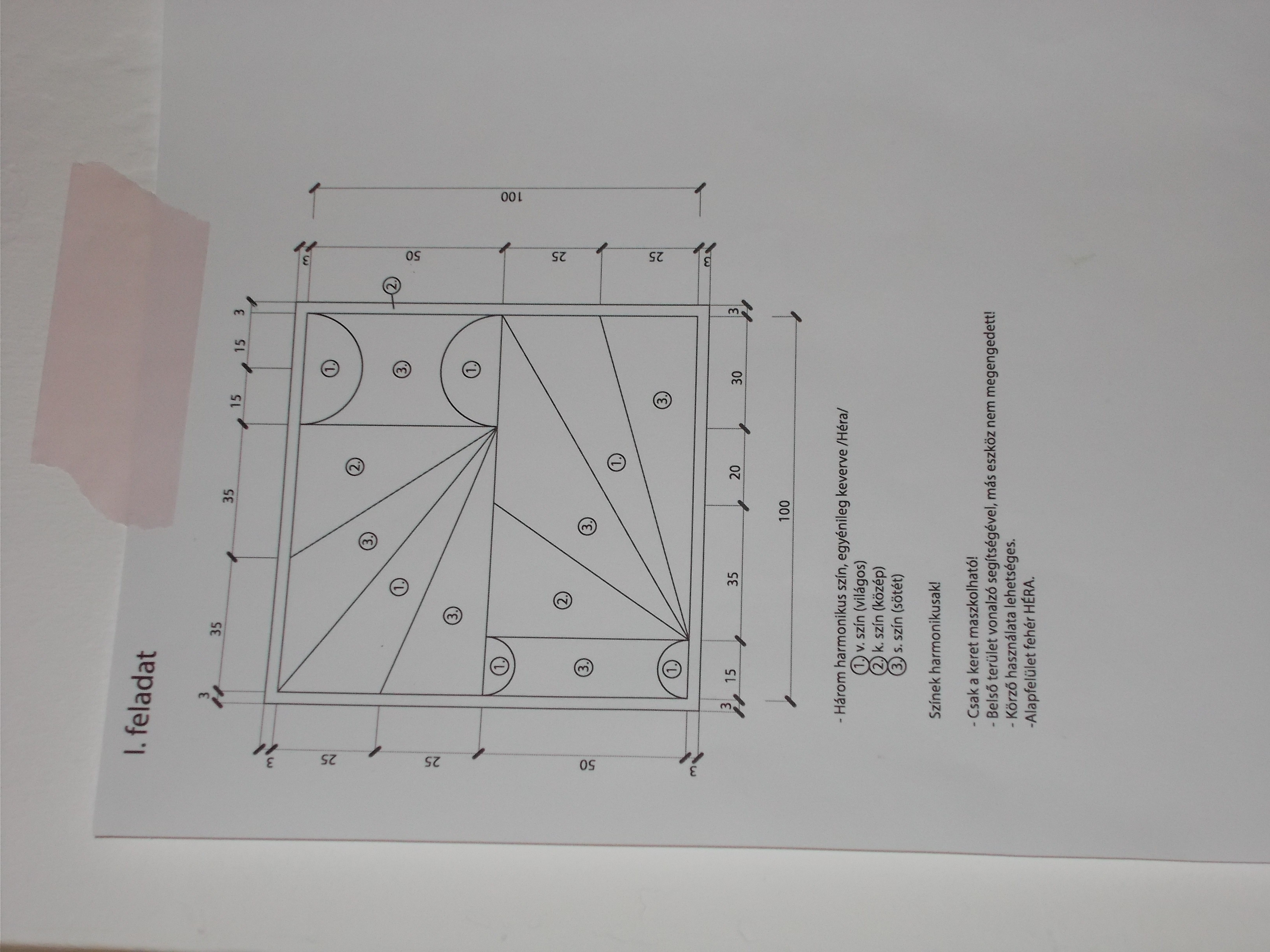 A versenyzőknek egy szerkesztési feladatot kellett megoldaniuk. Sima fehér felületre különböző geometriai ábrákat kellett felrajzolni és kifesteni, szabadkézi technikával, harmonikus színekkel. A feladat elvégzésére 4 óra állt rendelkezésükre.