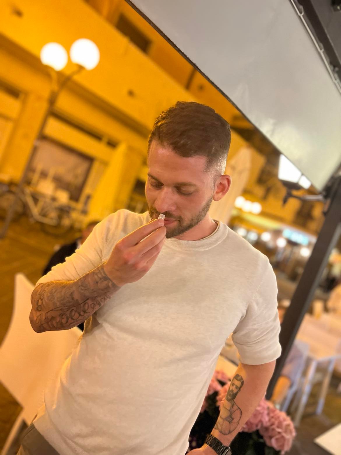A kóstolás is pontosan „megkomponált” módon történik, A tányérra 1 dkg sonka kerül, a hagyományoknak megfelelően nagyon vékonyra vágva, mellé a rövid ellátási láncban előállított helyi sajtokat tettek és különleges gyümölcsvelővel tálalták.