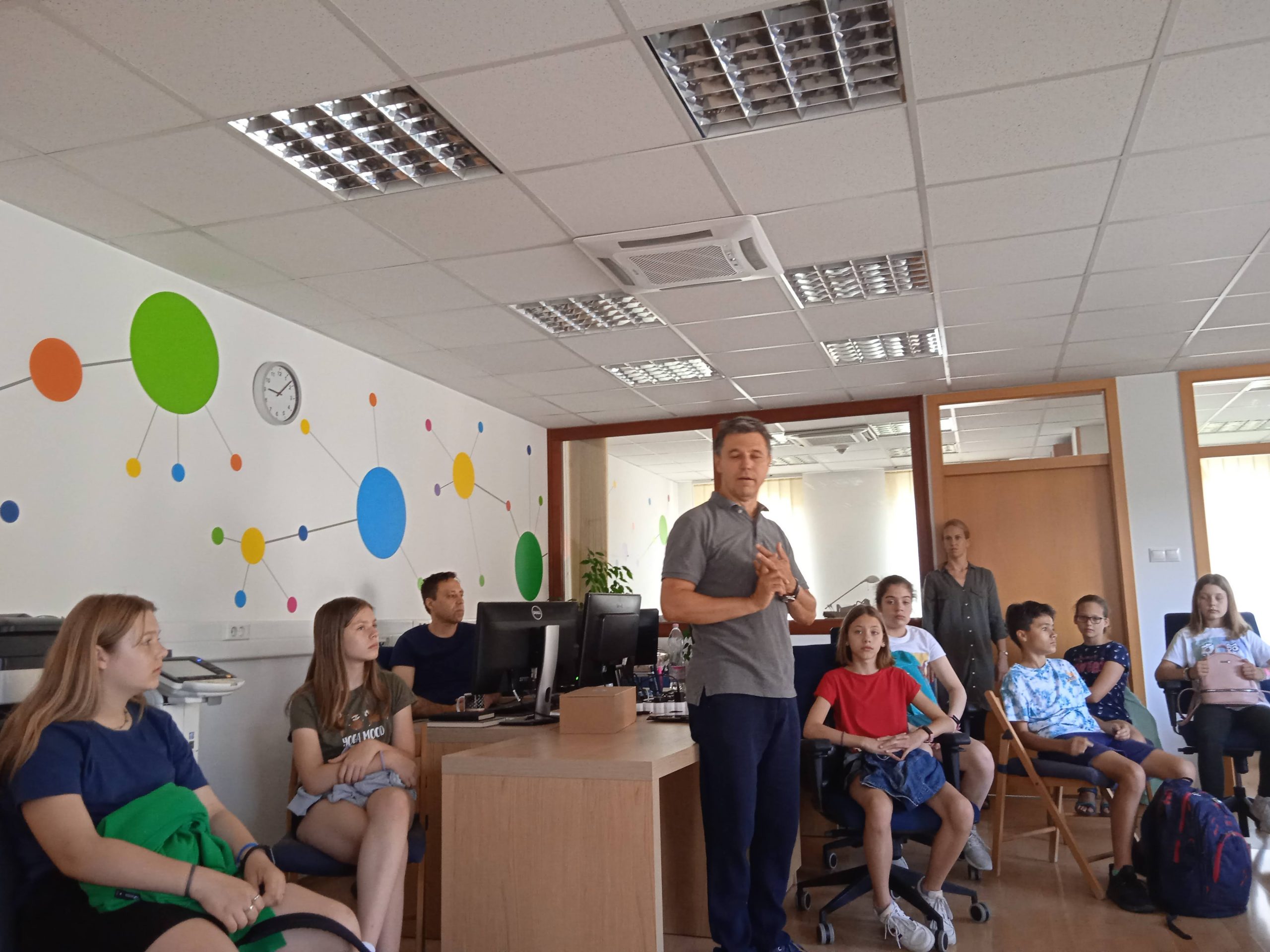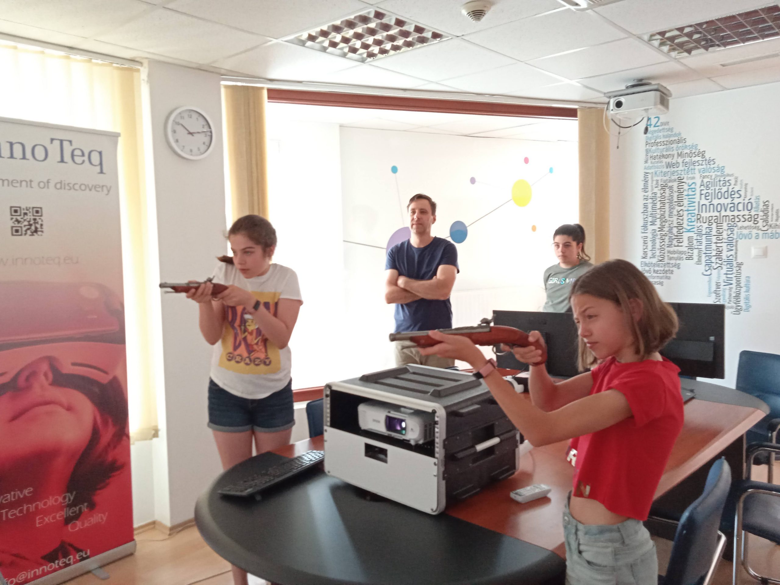 Már 3. éve megyünk az Innoteq Kft-hez a táborozókkal. Megunhatatlan, amit a cég évről évre mutat nekünk. Digitális kalandozáson jártunk, a valóság határait átléptük és a virtuális térben mozogtunk. Különbséget tettünk a virtuális valóság és a kiterjesztett valóság között. Szuper interaktív céglátogatás során az informatika ismeretlen területeivel találkoztak a gyerekek. Hiánypótló volt ez a foglalkozás, végre-végre bebizonyosodott, hogy az informatikus nem is olyan „kocka”.