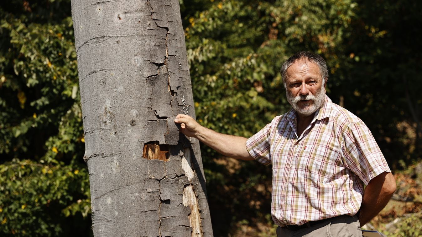 A csaknem húszméteres fa látott már szebb napokat. A lombkorona inkább egy megtépett pamacsra emlékeztet, a felső négy métere teljesen elszáradt. „De vannak még ennél is rosszabb állapotban lévő fák. Ennek a bükkfának a sorsa is meg van pecsételve” – mutat egy másikra. Megtudom: több mint száz éve része az itteni élőflórának.