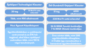 A klaszterek az innovációs ökoszisztéma gyakorlati gyorsítói: a kamara által támogatott – különösen gépipari, építőipari – együttműködések olyan szakmai közösségeket építenek, ahol a vállalkozások nemcsak kapcsolatokat találnak, hanem közös fejlesztési irányokat, pilotlehetőségeket, beszállítói együttműködéseket és nemzetközi projekt-kapcsolódásokat is.